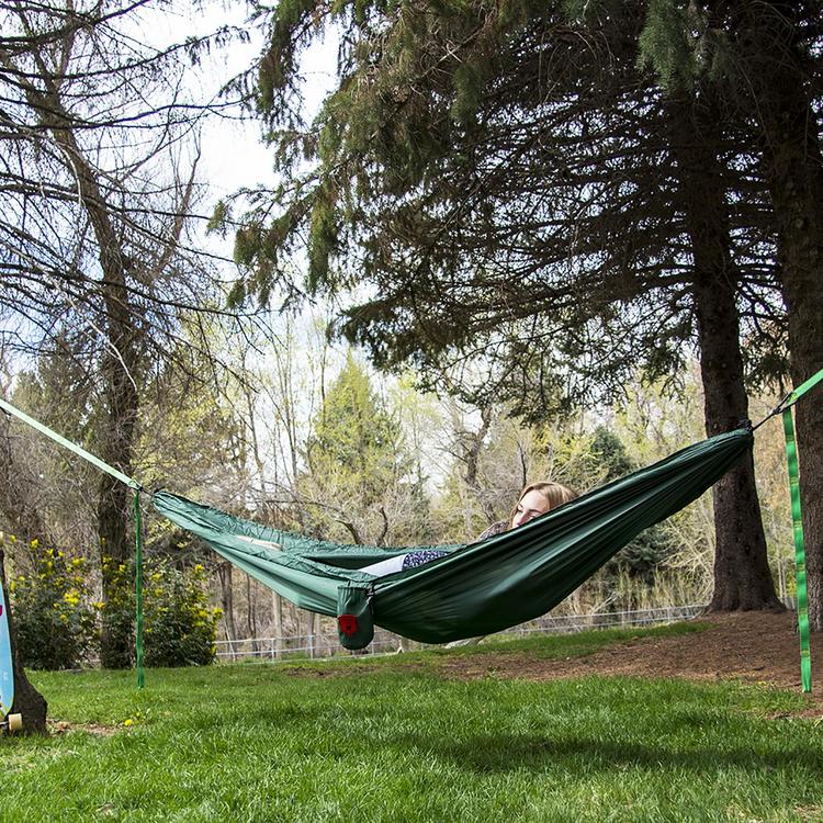 The forest green ultralight travel hammock by grand trunk offers a compact, lightweight and easy way to enjoy a comfortable rest while camping, traveling or even at home.